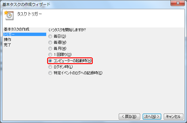 33.请在「任务触发器」画面点击「电脑启动时(H)」,然后单击「下一步(N)」。