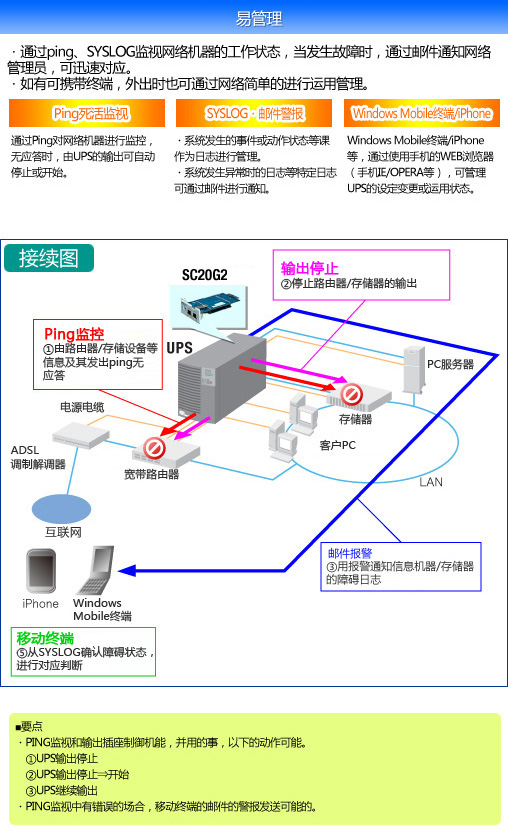 对应在网络管理中作为标准所使用的SNMP,通过网络上的SNMP管理对UPS进行管理,与UPS接续的<Macintosh电脑或PC服务器(Windows/Linux/Unix)等>可经由网络使复数台电脑自动关机、或使UPS自动停止。而且,当输入电源恢复后UPS可自动启动、电脑也可重新启动。