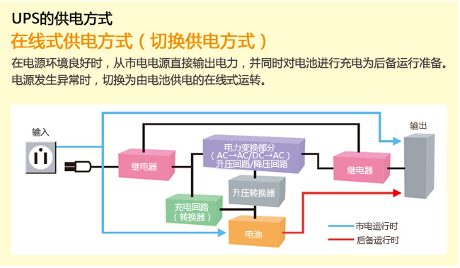 除了在线式供电方式,有能够高效率的自动切换在线式供电方式及后备式供电方式的“供电方式自动切换”可供选择。无瞬间中断切换。抑制消费电力,降低电费。