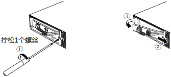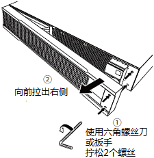 1.使用六角螺丝刀或扳手逆时针拧松UPS前面板右部的上下2个螺丝(螺丝为无法从前面板拆卸的构造)。①