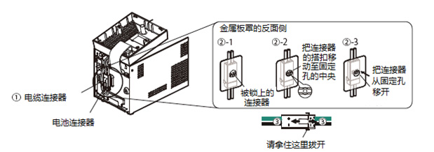电池连接器被锁在金属板的固定孔上,因此请拿起连接器,移动至固定孔的中央,向后拉连接器以解锁。